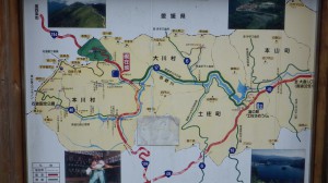 険しい山間部を縫うように作られた県道の開通記念碑前
